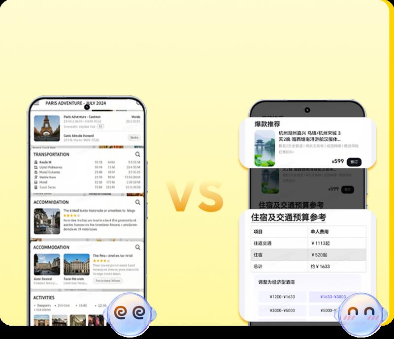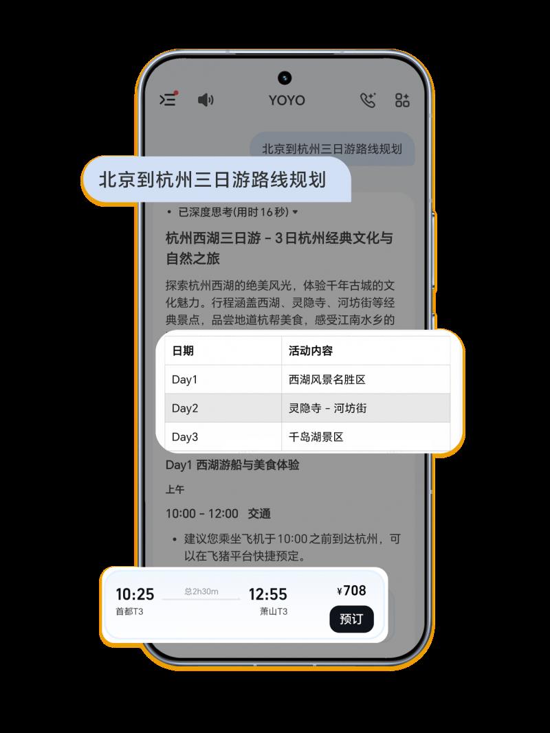 相較于傳統App打開-搜索-篩選-查看的流程,如今用戶則無需反復研究制定出游攻略、多平臺比價,只需對YOYO說一句:“北京到杭州三日游路線規劃”,它便能深度理解“短程”“小眾”等用戶意圖,結合實時航班動態、酒店余房、景區人流數據等,分析整理出結構清晰的綜合方案。如果臨時想調整計劃,只需告訴它:“第二天不想去西湖,有沒有室內替代方案?”行程隨之動態更新,靈活如私人定制。